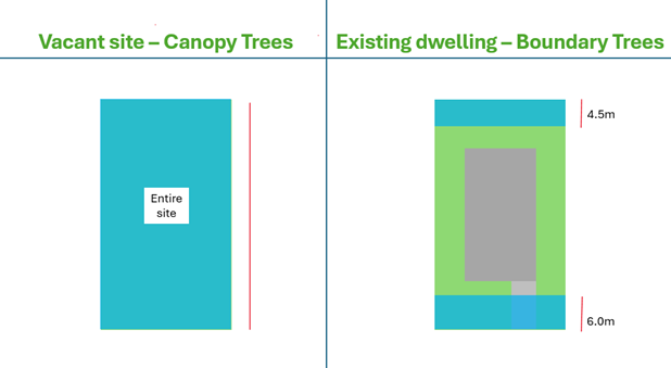 If the site has an existing residential dwelling situated on it, you will need a permit to remove, destroy or lop a tree that ticks the above 3 boxes within the front 6m and the rear 4.5m (see below images).