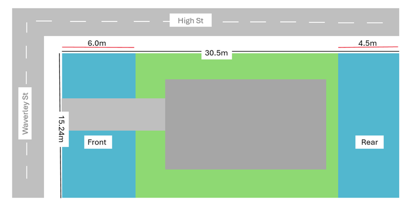 In the below example the side facing Waverley St shorter than High St, so Waverley St will be the ‘front’. The rear setback by default is automatically opposite the front.